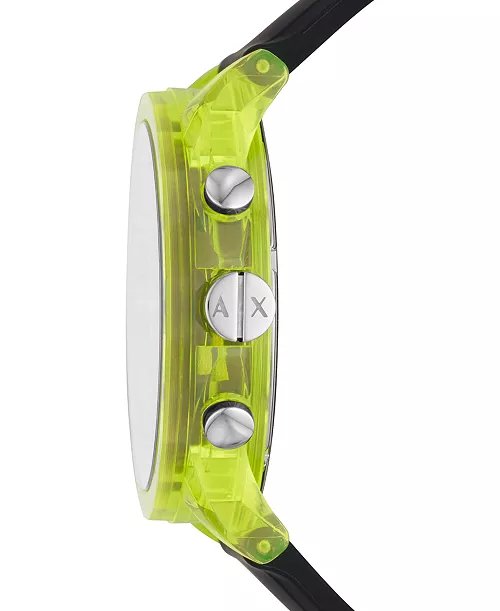 Upgrade your wrist game with the Armani Exchange AX Chronograph Watch featuring a striking gold-tone case and a premium black rubber strap. The deep black dial with neon-green highlights delivers a modern, sporty look, while the chronograph sub-dials add a performance edge.