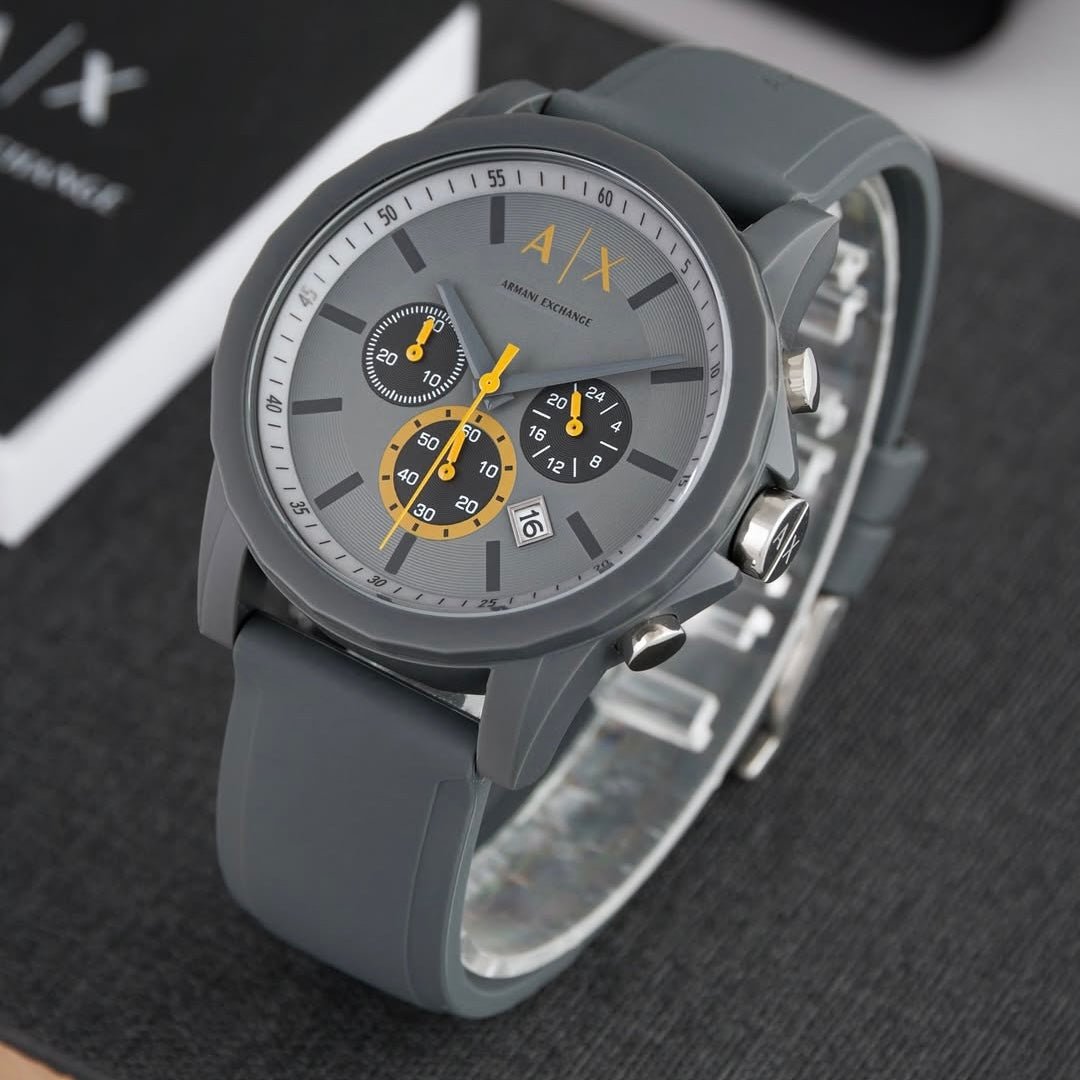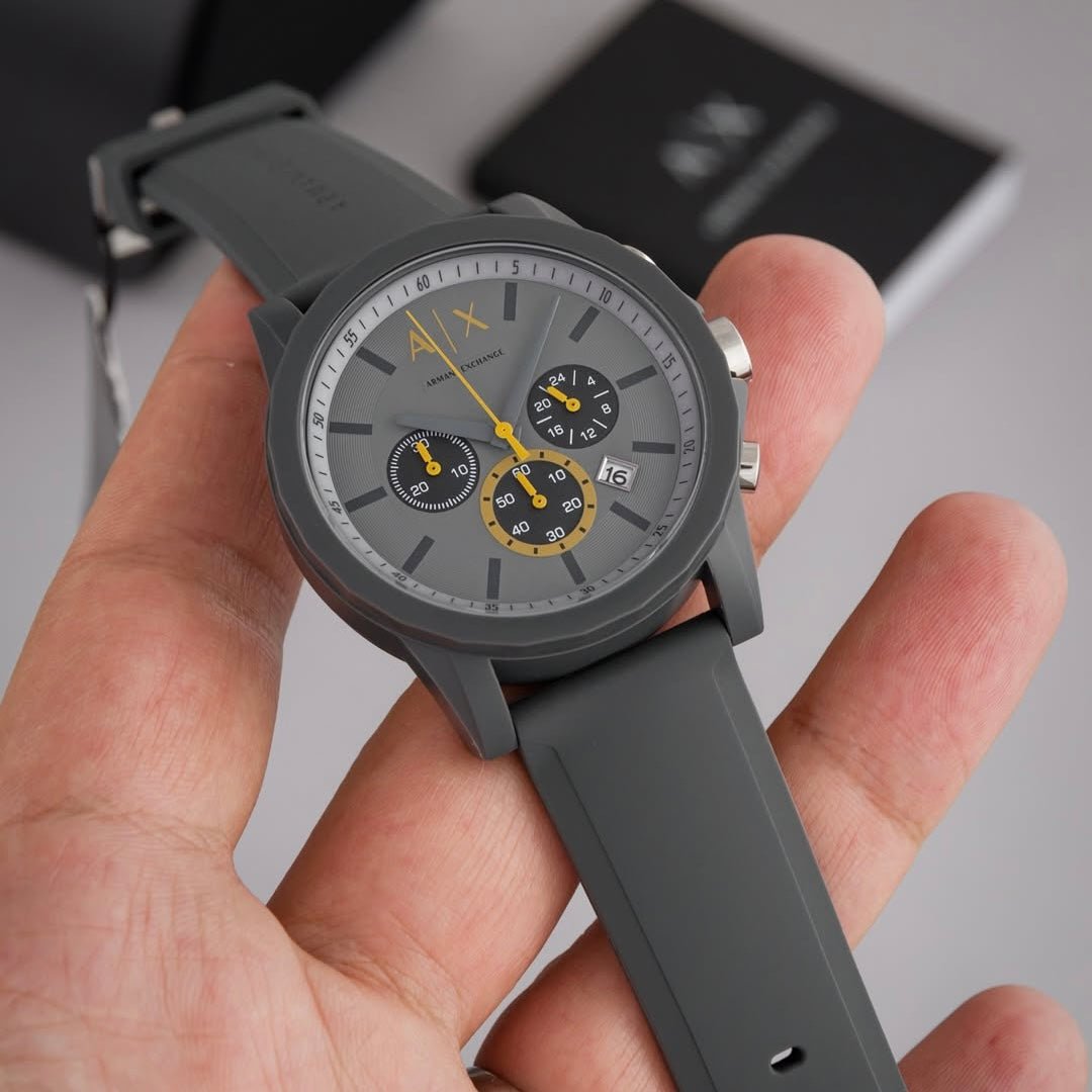 A stylish chronograph men’s watch with a bold grey dial, soft silicone strap and quartz movement for daily wear and occasions.
