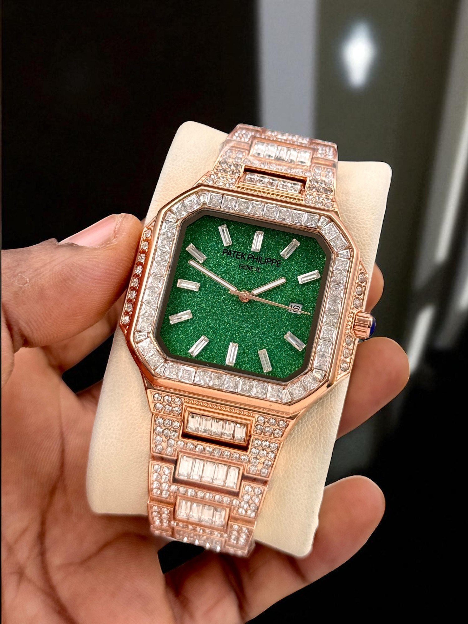 Premium gold-tone square watch with sparkling green dial and diamond-style bezel for a bold luxury look.