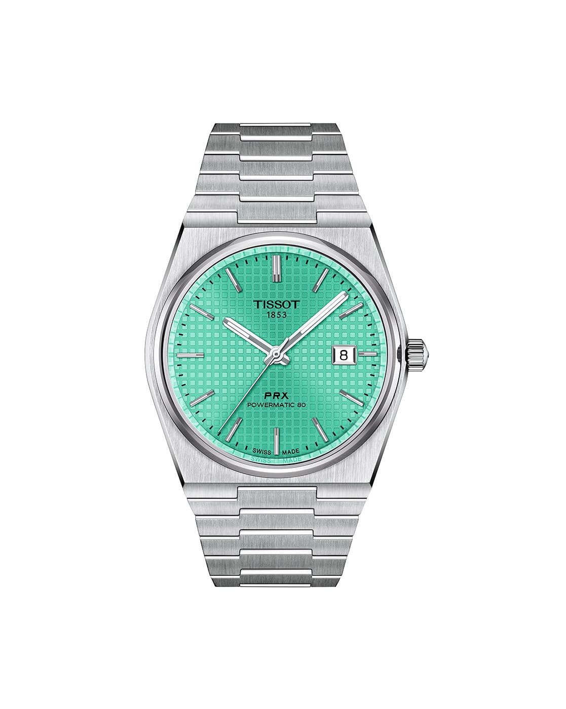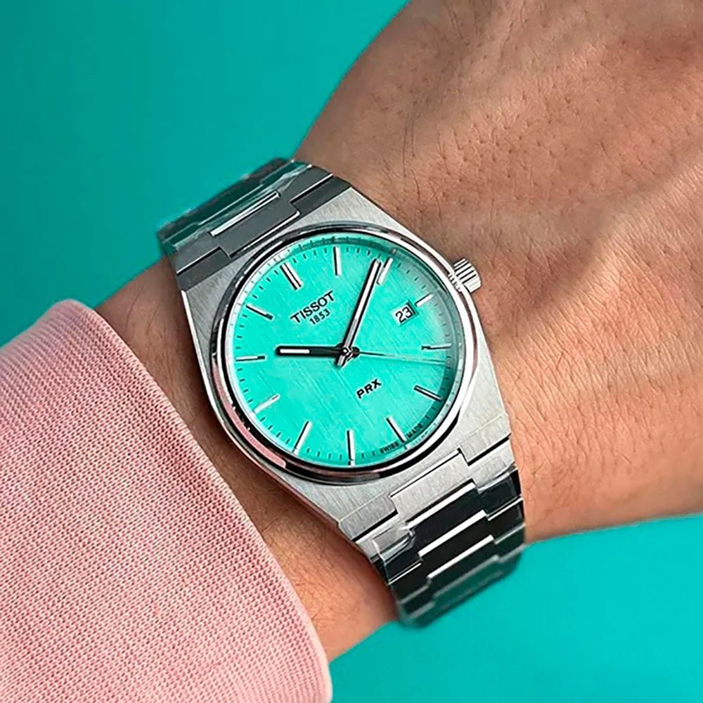 Stylish men’s watch with sky blue textured dial, date display and stainless steel strap.