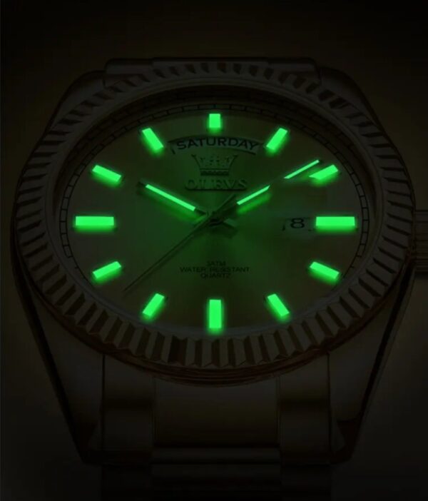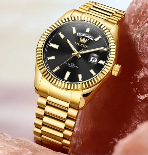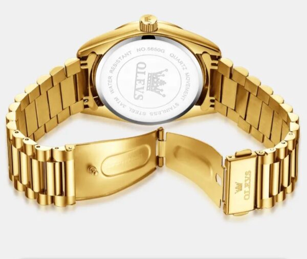 OLEVS 5650 is a premium gold-tone men’s watch with Day & Date display, luminous markers, and original quartz movement, designed for elegant daily wear and special occasions.