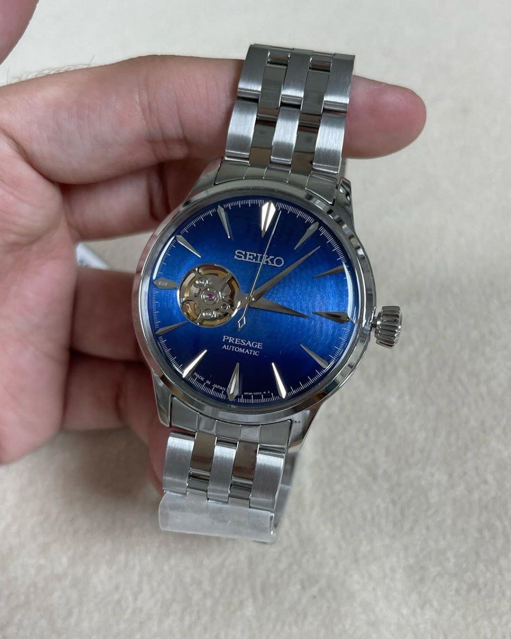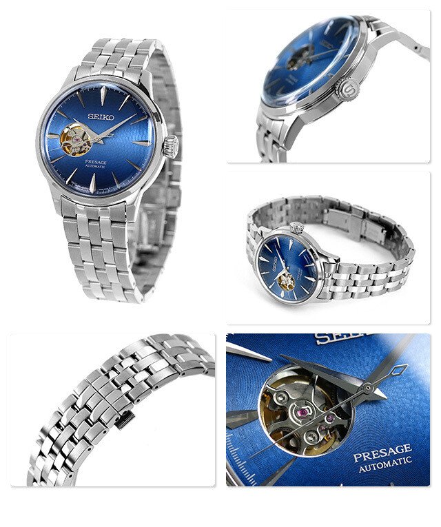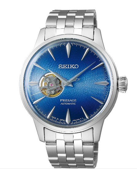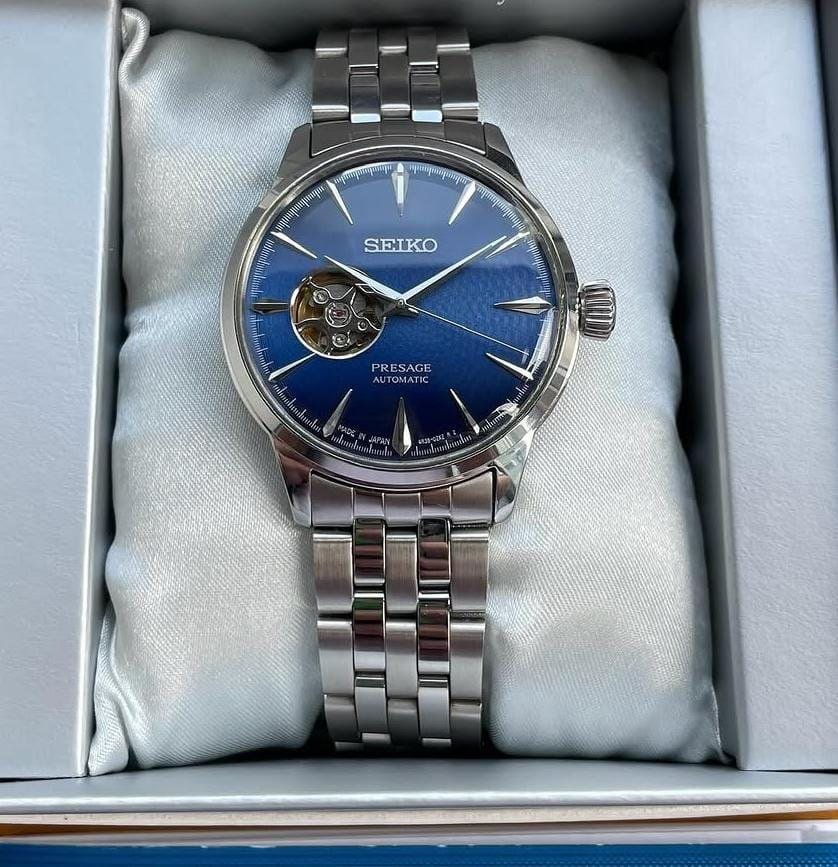 Elegant blue sunburst dial ke saath Seiko Presage automatic watch. Open-heart design, stainless steel strap aur premium Japanese automatic movement.